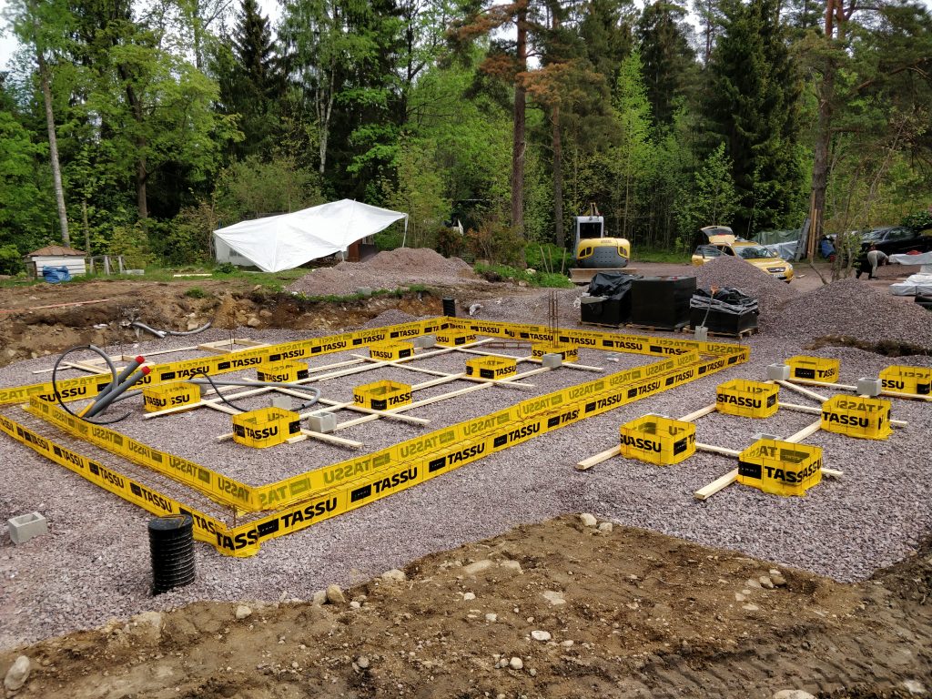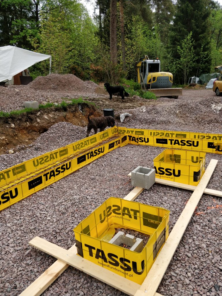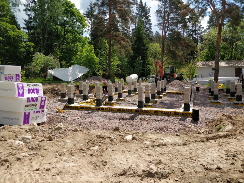 Maarakentaja oli saanut sorapedin tehtyä ja timpurit olivat mittailleet Lammin anturat paikalleen. Tässäkin sattui vielä sellainen pikku kämmi, että maarakentaja oli laittanut anturoiden alle 0-32 soraa (ei kapillaarikatkoa), kun olisi pitänyt laittaa 16-32 soraa (kapillaarikatko). Anturat päädyttiin sitten purkamaan ja laitettiin 15 cm lisää karkeampaa soraa, ja mittailtiin anturat uudestaan paikalleen. Pientä stressiä, lisäkuluja ja aikataulun viivästymistä se toki aiheutti, mutta hengissä selvittiin siitäkin.