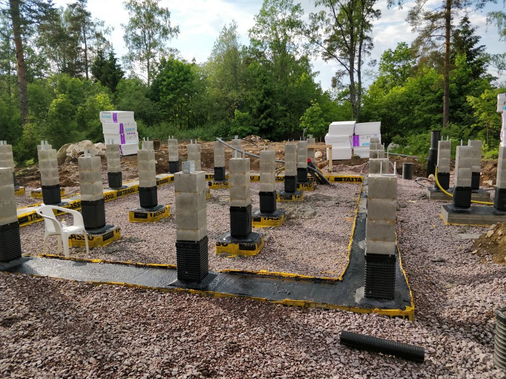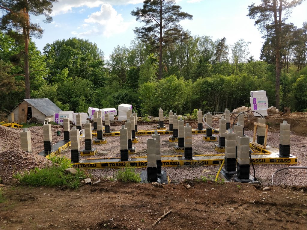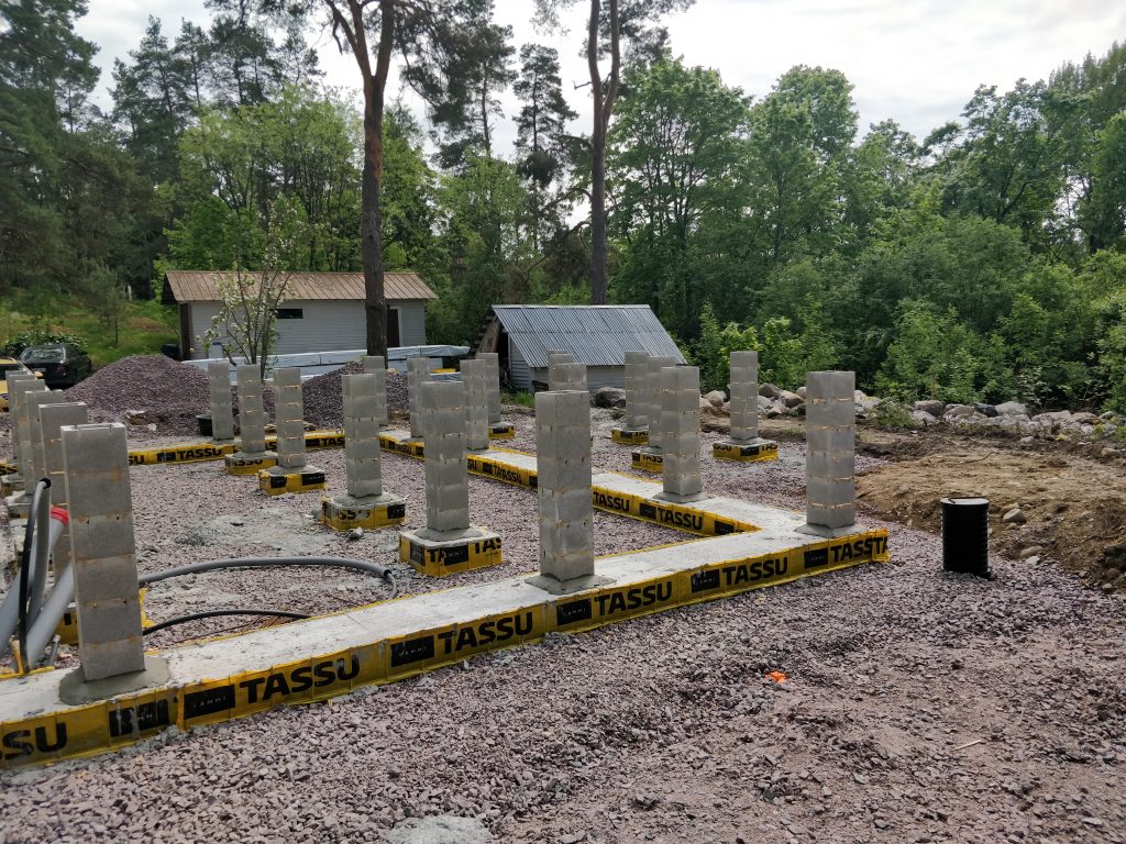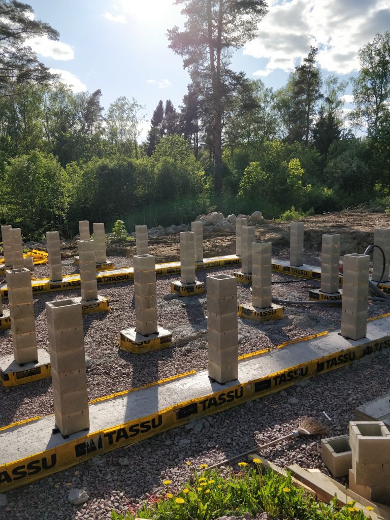 Anturat palasivat paikoilleen ja saivat betonitäytteen. Loppuviikko meni timpureilta pilareita säätäessä. Halusimme täysin tuulettuvan perustuksen, joten pilarit tuntuivat parhaalta ratkaisulta. Myös valusokkelia harkittiin, mutta päädyttiin kuitenkin pilareihin. Hinta olisi todennäköisesti ollut lopulta about sama.