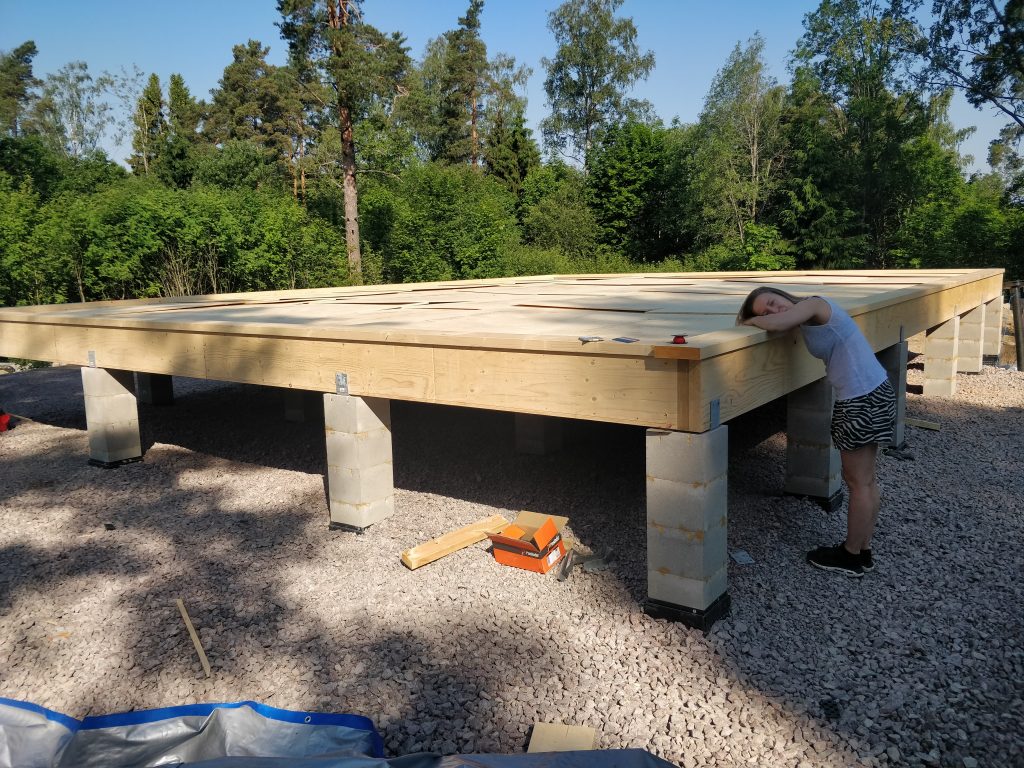 Emme kerenneet pariin viikkoon käymään tontilla. Tällä välillä oli saatu routaeristeet sekä loput sorat paikoilleen. Timpurit olivat päässeet aloittamaan kunnolla hommansa ja alapohja eli tanssilattia paikallaan.