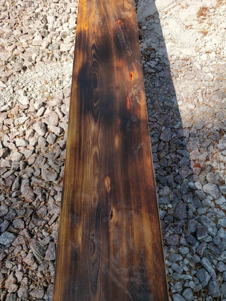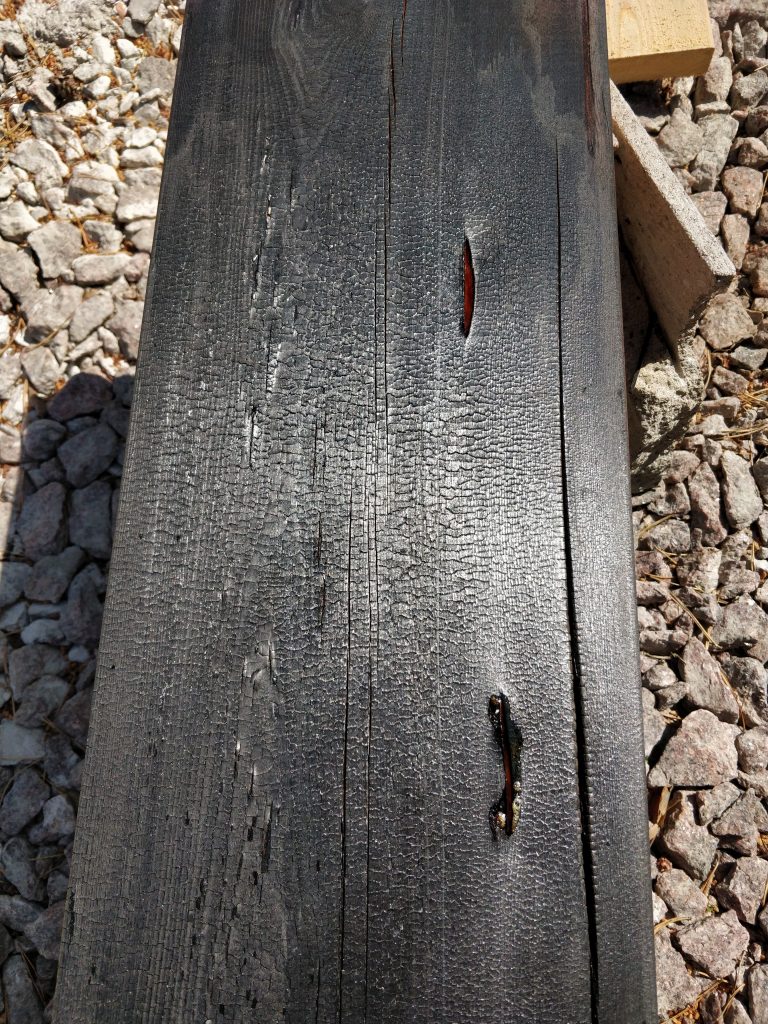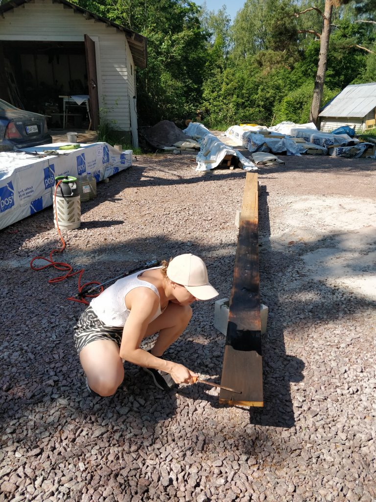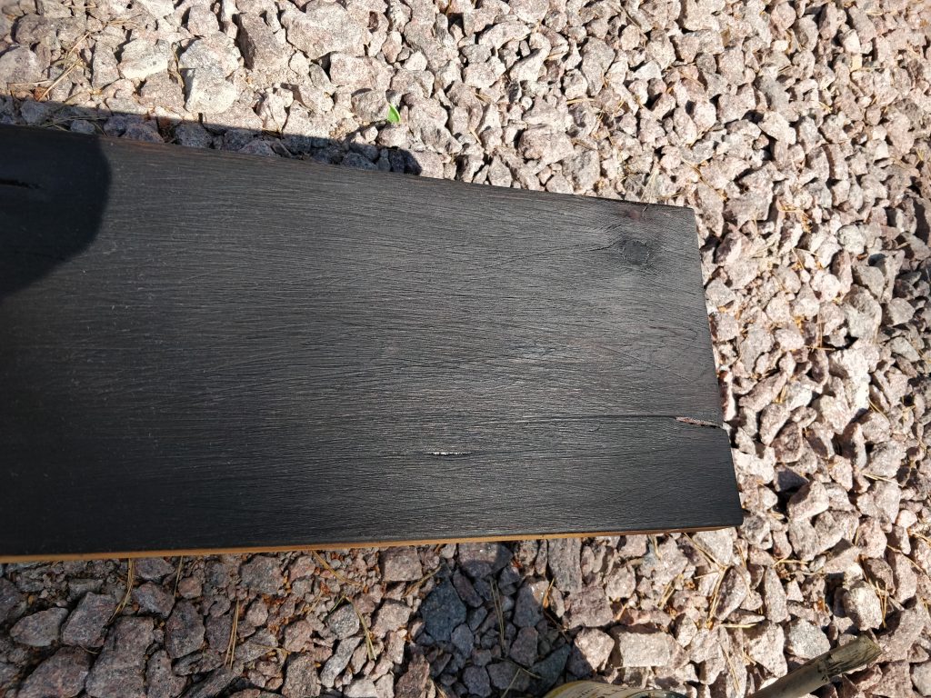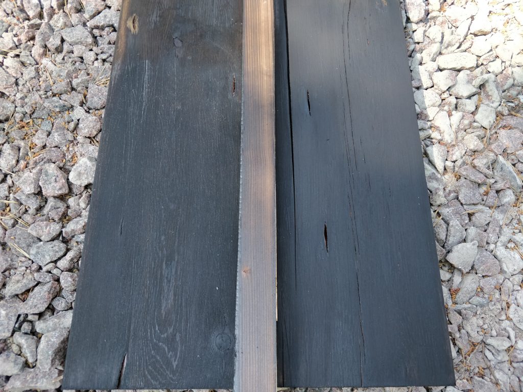Päätettiin aiemmin, että vaihdetaan Roslagin mahonki-väri Shou sugi ban-hengessä käsiteltyyn lehtikuuseen. Eli käsittely koostuu karrelle poltosta, teräsharjauksesta, puhtaaksi harjaamisesta ja öljyämisestä. Viikonloppuna testailtiin, miltä laudat tulevat näyttämään. Polton voi toteuttaa eriasteisena, riippuen halutusta lopputuloksesta. Palaan tähän blogissa myöhemmin, mutta tältä näyttivät eri asteiset koepalat: