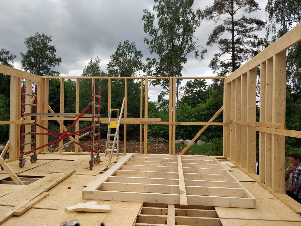 Juhannusviikonloppu. Tässä välissä runkotolpat oli saatu pystyyn. Sisällä alkoi vihdoin hahmottamaan talon ja eri huoneiden mittasuhteita. Jäi hyvä fiilis kokonaisuudesta, tilat olivat kompakteja, mutta kaikin puolin riittävän kokoisia ja toimivia. Ei ole turhaan Heidi viettänyt talvi-iltoja taloa piirtäen.