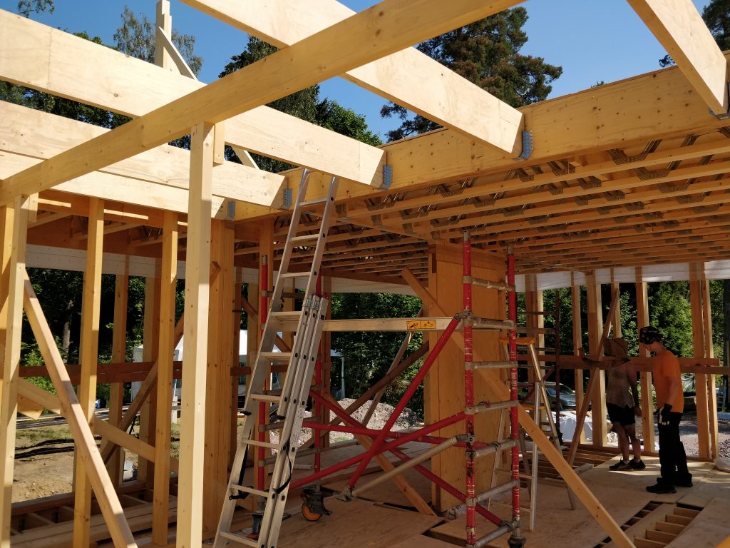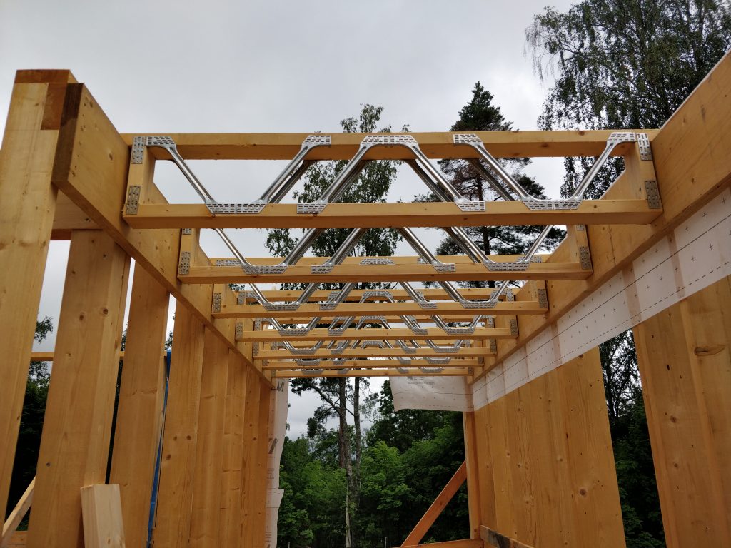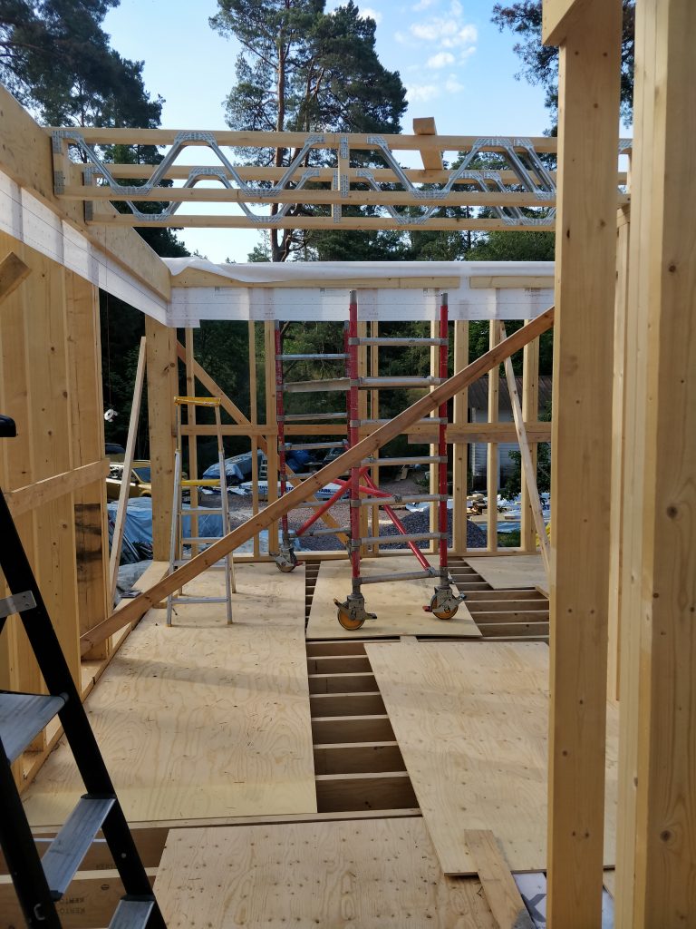 Melkeinpä nykyhetki. Kattoristikoiden pitkä toimitusaika yllätti projektipäällikön ja niitä jouduttiin hieman odottelemaan. Soittelemalla ristikkotoimittajat läpi saatiin kuitenkin ristikot tilattua lakeuden puutuotteelta heinäkuun puoleen väliin, mikä on meidän hommien kannalta riittävä suoritus. Timpurit olivat olleet toisilla työmailla osan viikoista ja tässä välissä oli tulleet pelkästään posipalkit paikalleen välipohjaan. Jäin itse lomille 9.7., joten nyt olisi tarkoitus pyöriä päivittäin tontilla itsekin.