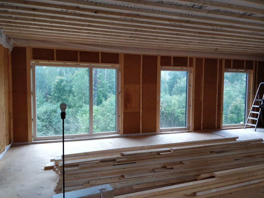 Talon alakerran ikkunat ja liukuovi saatiin edellisellä viikolla vihdoin paikalleen, joten uskalsimme aloittaa seinien eristämisen. Apuna tällä viikolla oli isäni Tapani ja hänen vaimonsa Eija. Tällä viikolla poltettiin samalla myös viimeisiä ulkovuorauslautoja ja painittiin alapohjan levyjen sekä jyrsijäverkon kanssa. Timpurit asensivat loput ikkunat ja asensivat yläkerran katon ilmansulkupaperin ja koolaukset.