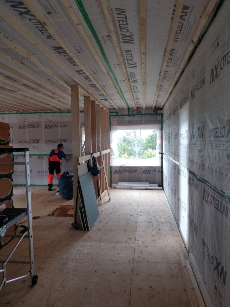 Loppuviikosta ensimmäiset 100+100mm Huntonia oli paikallaan sekä ylä- että alakerrassa ja päästiin laittamaan ilmansulkupaperia paikalleen. Pitkän pohdiskelun jälkeen päädyttiin Intello-merkkiseen “älykkääseen” höyryjarruun. Vesihöyryn läpäisevyys siis vaihtelee lämpötilan mukaan. Talvella kosteuspiste on huomattavasti syvemmällä seinässä (Intello ei päästä juuri kosteutta lävitseen), kesällä taas kosteuspiste ei oikeastaan synny seinän sisään, joten kosteus pääsee liikkumaan Intellon läpi vapaasti. Olen miettinyt miten tämä käytännössä toimii kun kangas on kuitenkin sisäseinän puolella, jossa lämpötilakin on melko vakio ympäri vuoden. No, ainoa haittapuoli tuossa oli hinta (n. 4e/m2), muuten pätevän oloinen tuote kaikin puolin.