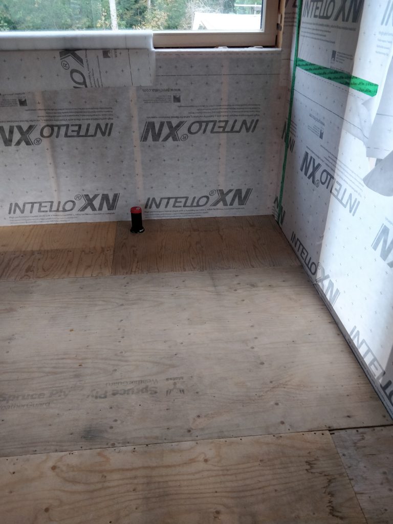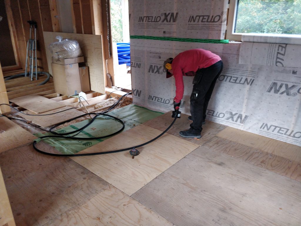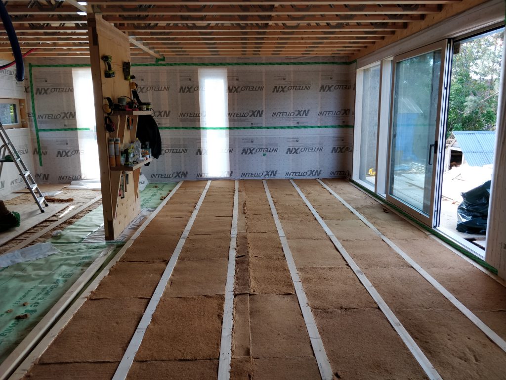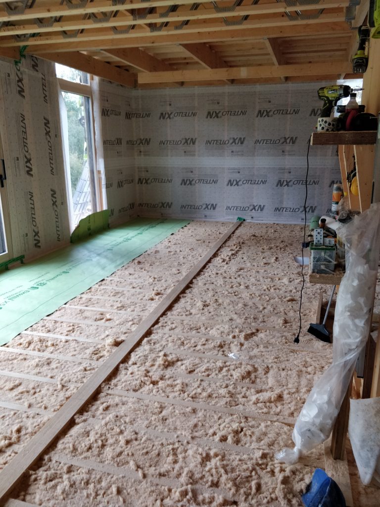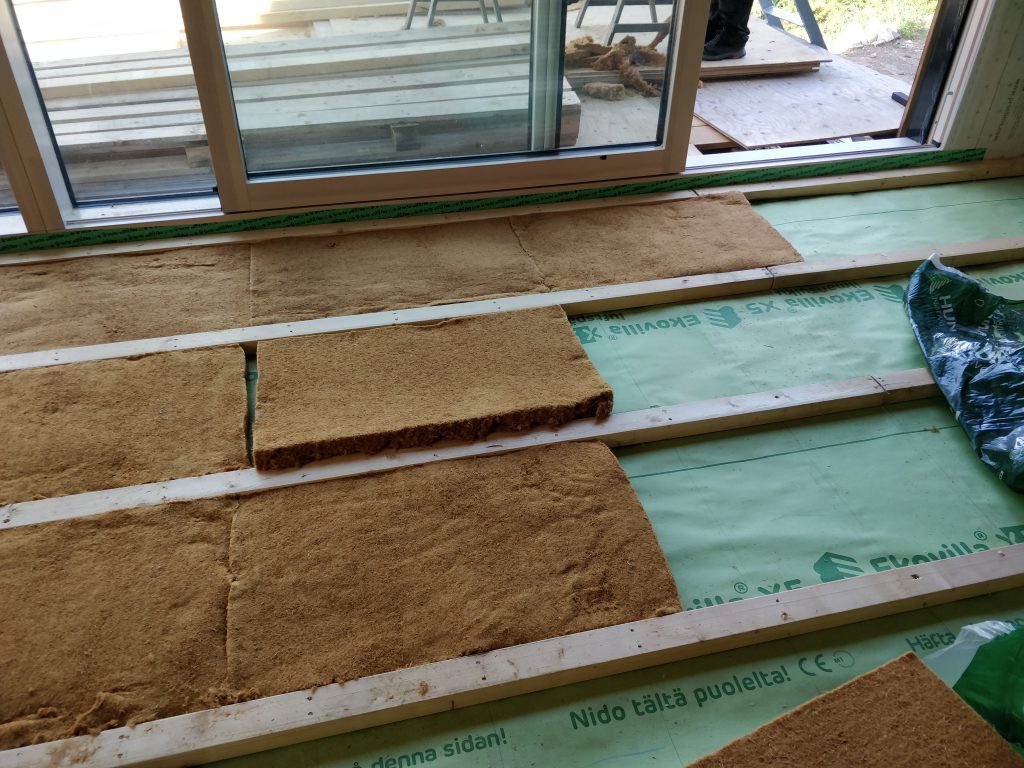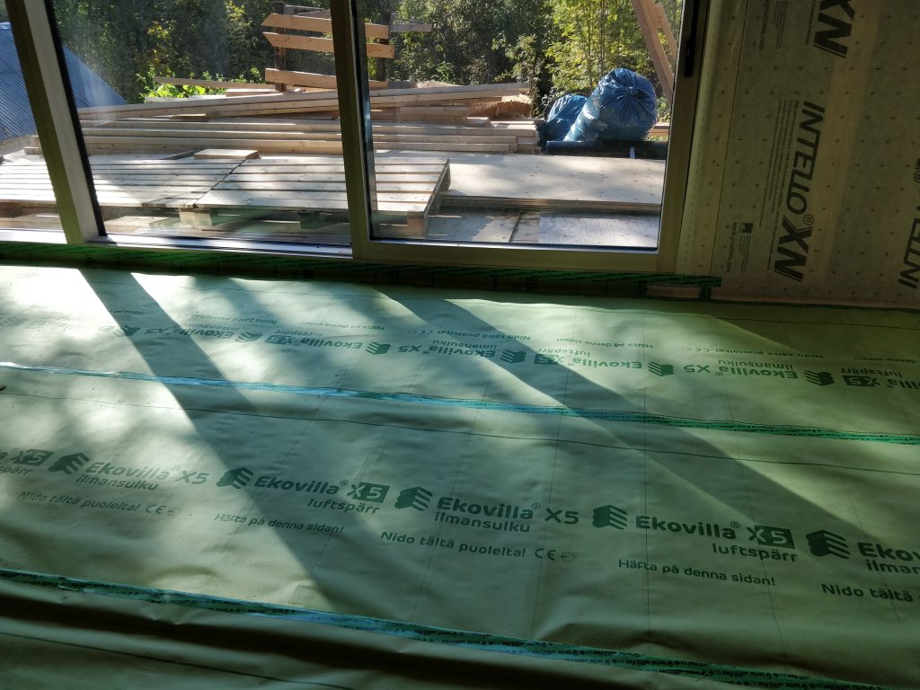 Viikko alkoi lattian paperoinnilla. Lattiaan päätettiin laittaa ekovillan X5:sta. Päälle tulee vielä vaneri, joka toimii käytännössä jo höyrynsulkuna, joten pahvimpi koostumus riittää sen alla hyvin.