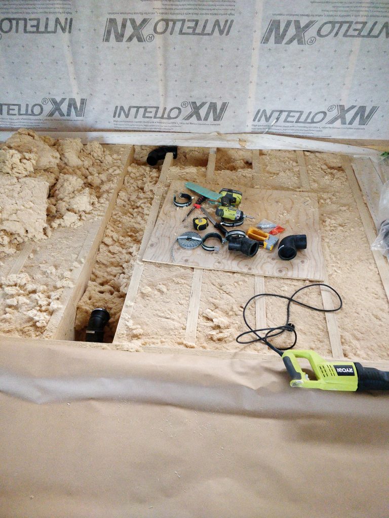 Keskiviikkona piti laittaa keittiön viemäri paikalleen, jotta saadaan keittiön lattiakin umpeen. Väsäsin viemärin itse, mutta tulin siihen tulokseen ettei minusta kyllä saa putkaria pitkällä tikullakaan. Sen verran nyhräämistä oli koko touhu.