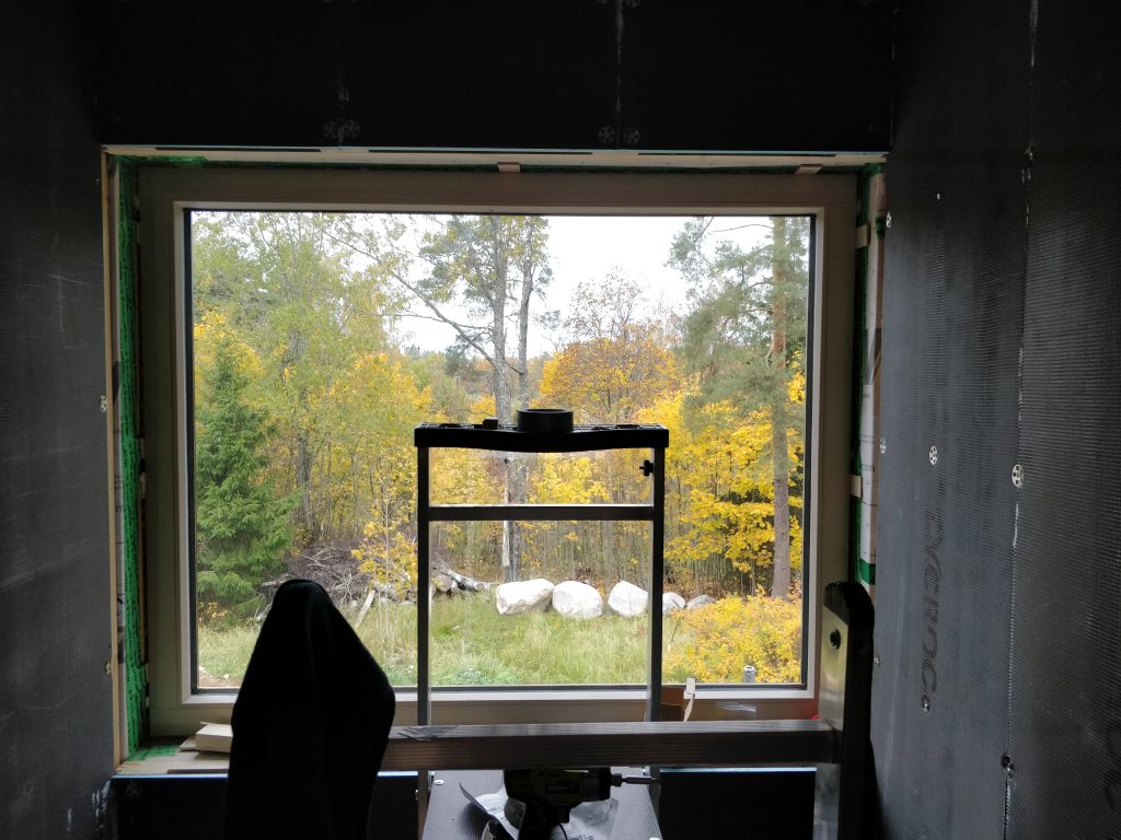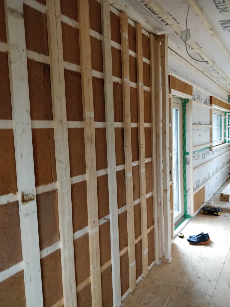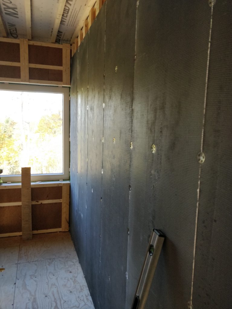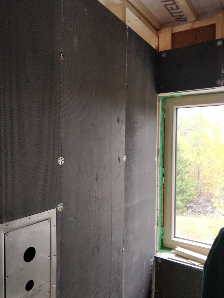Maanantaina jatkettiin yläkerran kylppäriä. Seinään tuli meillä ylimääräinen tuuletusrako 25mm ja pintaan Tycroc-levy. Eli tycroc on polyuretaanilevy, jossa molemmilla puolilla sementti-lasikuituverkko vahvikkeena. Nopea asentaa ja valmista pintaa tulee helposti.