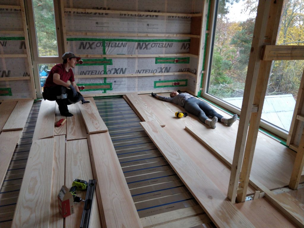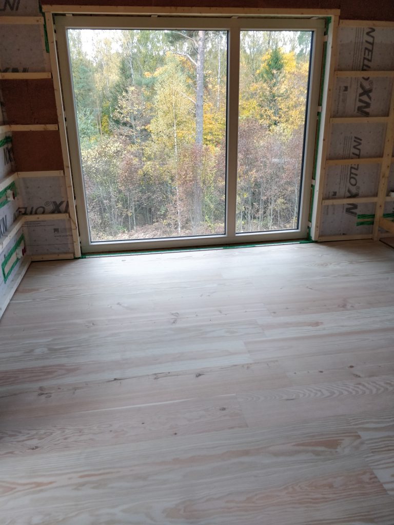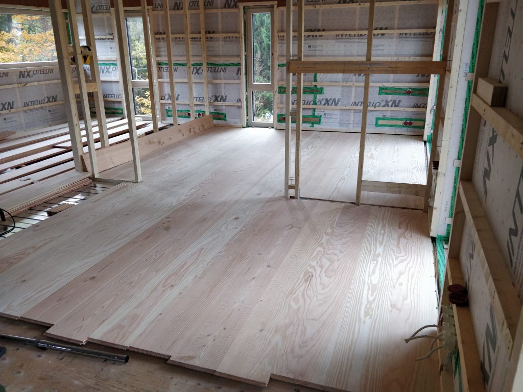 Perjantaina päästiin lopulta lattian asentamisen kimppuun. 25 cm Douglas-kuusilankut oli tilattu Tanskasta ja se oli yksi kohde mihin laitettiin rahaa. Tulimme siihen tulokseen, että lattia on talon osa, jota ei tule ihan ensimmäisenä vaihdettua ja se kuitenkin pitkälti määrittelee talon luonteen. Laminaattia emme koskaan edes harkinneet, vaikka siinä olisi säästänyt pitkän pennin. Mietimme pitkään myös mm. Timberwisen parketteja, mutta paremmilla parkettilaaduilla neliöhinta olisi ollut suunnilleen sama kuin leveällä laudalla, joten valinta oli lopulta helppo. Laudat tilattiin jo aikoja sitten keväällä, joten nyt kun rahat alkaa loppumaan niin ei voi enää vaihtaa halvempaan. Hyvä vinkki kaikille rakentajille.